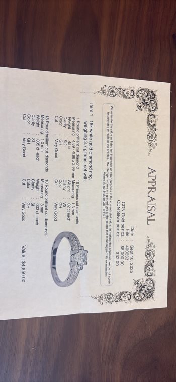 Appraised at $4850.00 plus taxes. 18k white gold diamond ring. No etransfers.