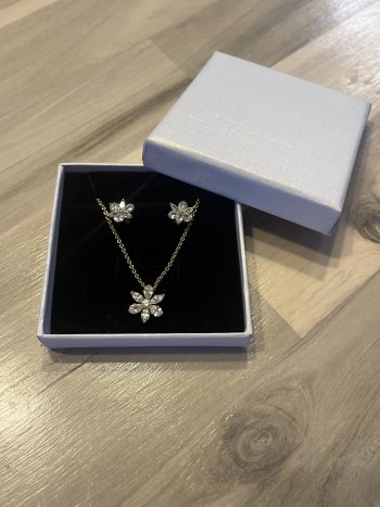 Cute Pandora flower jewelry set. Has necklace and matching stud earrings. Gold tone with sparkly diamonds. Comes in little white box since I am missing the original box. Earrings are $225 and necklace is $335.