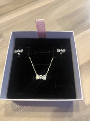 Cute Pandora set. Has a necklace and matching stud earrings. Both are bow shaped with diamonds. Comes in the original box.