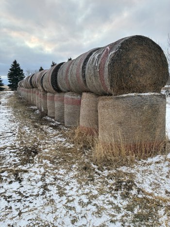 52 second cut round alfalfa hay bales for sale, rolled up with JD 567 baler. Approximately 1400 lbs each. $95 per bale. Stacked 2 high in mushroom style to shed water and they are not frozen to ground for easy loading. Located near Lenore, MB.