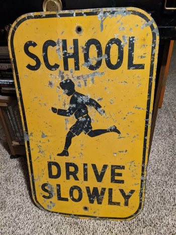 A nice original large size heavy steel 30" x 18" "School Drive Slowly" traffic safety sign. Made by Rosco Metal & Roofing Products Ltd Canada - this was an old Toronto sign company. Lots of honest use with great age - with NO bu**et holes! It was used in a prairie small city. They haven't used this particular wording in years. Pickup and payment in person or by etransfer. Can meet at Brandon Police lot - no holds without payment. Great sign for display with nice early child playing graphic! Texts or emails only please. REDUCED!!