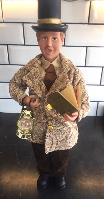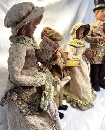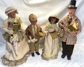 Large family of four in Victorian era dress, out Christmas Carolling. The 2 children stand 15 inches tall with the parents at 19 inches tall. Ideal decor for Christmas especially if you have a large fireplace mantle or shelf to display them. Great detail in the clothing and accessories.