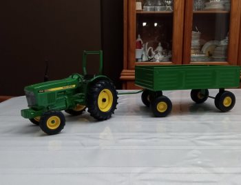 This is a John Deer toy tractor and wagon