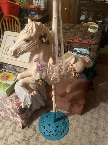 Wooden carousel horse, great decoration piece. it stands close to 5ft tall & 2ft/6 inches wide, heavy metal stand comes with. Idea for Christmas, for daughter/ granddaughter or even just for photo shoot. Asking $175.00 or best offer.