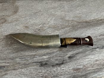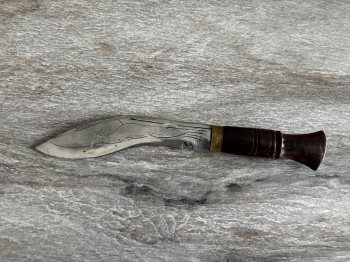 Etched Nepalese Kukri Knife: Gurkha Blade with Leather/Metal Sheath. Very nice etching on both the blade and sheath. The knife itself is 10? while the blade is 6 1/2?. Very nice show piece that would look good on display.