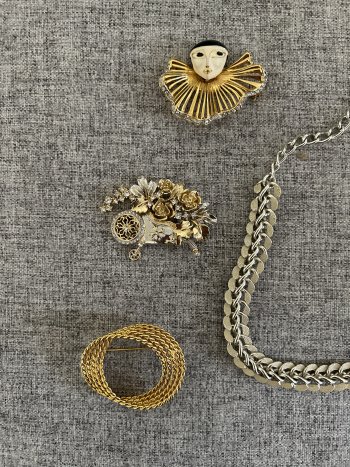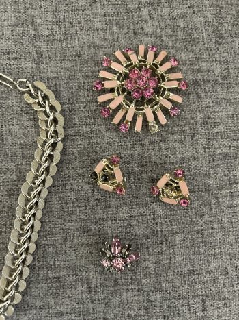 8 pieces of vintage costume jewelry. Mostly broaches. Broaches on the right (pink) are missing a few stones.