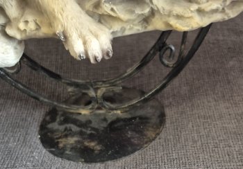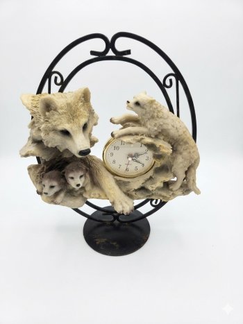 It a wolf family figurine clock with a metal stand. It's in good condition except the base has some wear to it. It would be a nice addition to your collection.