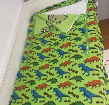 Excellent condition. Fun dinosaur-themed works like a blanket/sleeping bag, no more messy beds. . Features colorful dinosaur prints, side pockets, two zippered sides. Great for home, travel, sleepovers. Made of very soft fleece. Sits on the bed like a fitted sheet around the mattress.