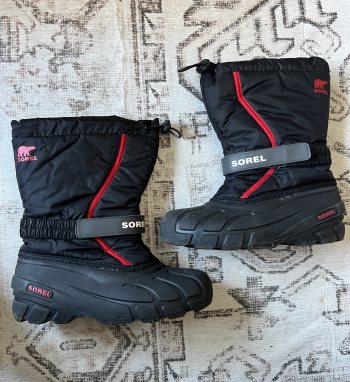 Sorel Youth size 6 winter boots in black and red. Worn for about a month, in great condition.