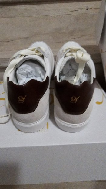 Premium leather sneakers with a hidden 6 cm height-boost sole. Clean, modern design in white leather with grey suede and brown leather heel. Adds height discreetly while looking like regular luxury sneakers. Great for everyday wear or as a gift. For adults. Foe weman could work too.