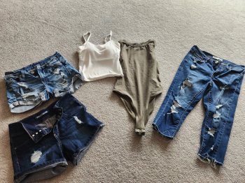 White n green top from shein size small. Both never worn i did remove tags to wash but realized I didn't like the shade of green... shorts are from bluenotes n eclispe size 3 capris are from eclispe size 3 also