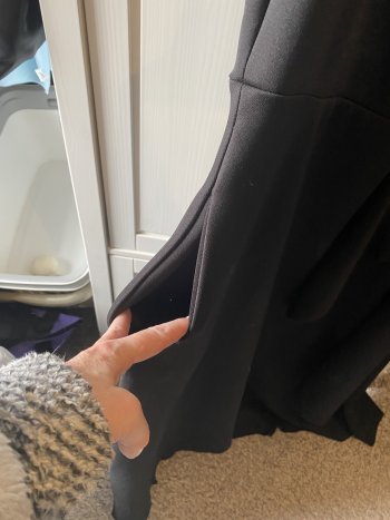 Elegant black wrap dress with POCKETS! Brand new, never worn. Material is thicker, not flimsy or filmy, cocktail length in front and long in back.