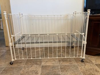 This is a 1920s era metal crib from Catherine Booth Hospital in Montreal.