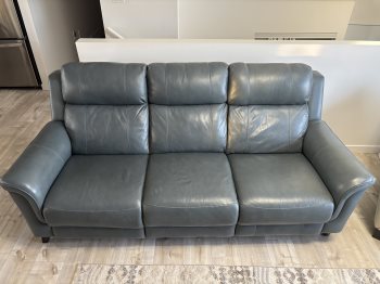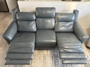 Leather power reclining sofa with adjustable headrests. USB ports on each side of couch. Will be available Friday December 12th for pickup. Very heavy, and will require some muscle to load. Purchased from The Brick. Some wear on back reclining sections as per last picture. Located in Brandon. $600. Open to reasonable offers.