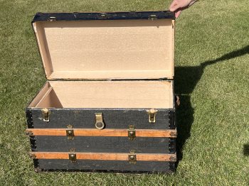 Vintage trunk with leather handles and gold/brass coloured edgings, It measures 18" deep x 34" long x 22" high. The trunk has good patina and shows good aging. Nice piece of nostalgia.