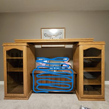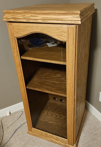 2 Oak Cabinets with glass doors and adjustable shelves. Detached top can be used over a TV , entertainment unit or fireplace. When used with the top the space between cabinets can be adjusted within the length of the top.