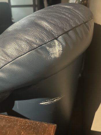 Leather loveseat. In decent condition. Leather conditioned regularly to keep soft. A little bit of wear and tear, with a couple white marks at the back of it (see pics for any marks, etc), but otherwise in great shape. $250 obo.