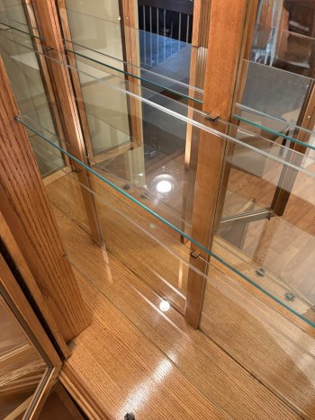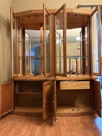 Solid Oak China Cabinet, with glass shelves and light up cabinet.
