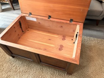 Functional coffee table with a lift-up lid and hidden storage ? perfect for blankets, magazines, or games. Features a cedar wood interior which helps keep stored items fresh.