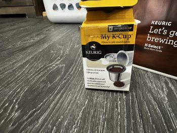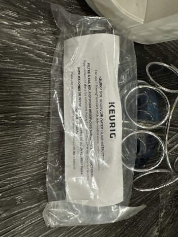 This set has the white Keurig machine, a chrome K-Cup carousel holder (holds 27 pods), and a Keurig My K-Cup reusable filter. The coffee maker has options for different cup sizes and a strong brew setting. It also includes the quick start guide and the water filter attachment.