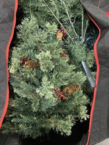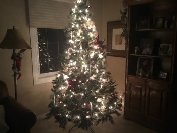 Have a 6-7 ft prelit tree with ornamental decorations attached on it. Some lights not working on lower branches but could add a string to it. Comes in a storage box and also has the stand.