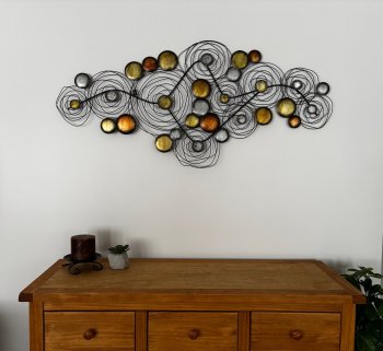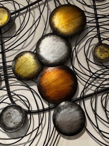 This black metal piece of art with gold, silver and bronze accents measures approx. 2 feet x 4 feet. New condition. It can be hung horizontal, vertical or any way you choose for your space.