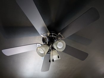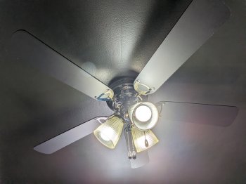 Gun metal grey in colour with black fan blades, fan blades are reversible, and works great! Email please.