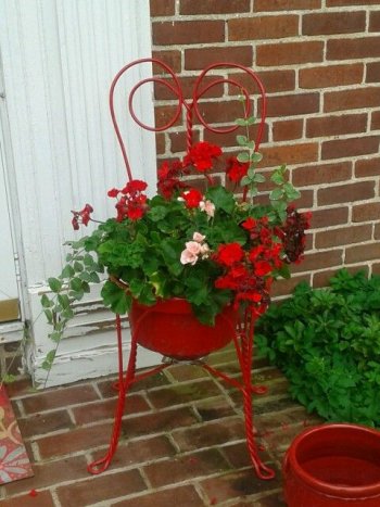 Metal powder chair frame ideal for potted plants or display, it is gray and can be painted another color, height 33 inches.
