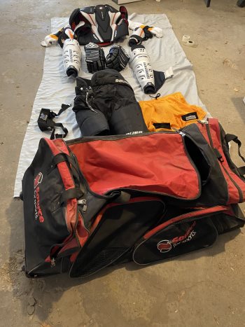 Hockey gear, including bag, as seen in the photo. Pants are size large.