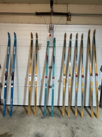 selection of cross country skis , Karhu, Lahti, 195 cm ,$ 80.00, Skilom 200 cm. $60.00 . Vintage Madshus wooden 200 cm. 210 cm. $150.00 each .poles $15.00 a pair