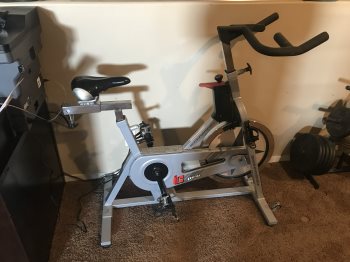 Schwinn IC Pro exercise bike with quick clip pedals, adjustable seat and handles.