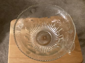 Heavy, Glass Punch bowl comes with a ladle, 8 glass cups and 8 hooks. Excellent condition no chips or cracks.