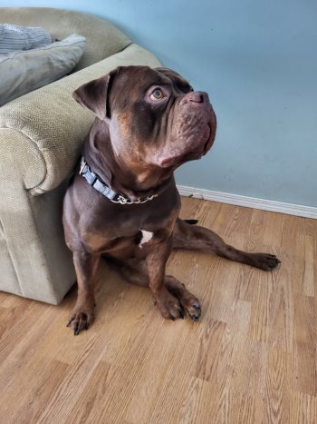 Rehoming our 2yr old american xl bully. Intact male. He's a beautiful chocolate tri-color. He'll be a great dog for the right person. He'd be perfect for a single adult male. He's lived with a small dog his whole life but they have had some issues. He's kennel trained and comes with his kennel. Not good with big dogs. He has a strong prey drive and can be very stubborn. Very powerful dog that requires a strong willed owner. Approximate weight is 135lbs
