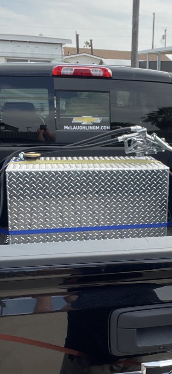 Aluminum 50 gal fuel slip tank with electric pump with 12 volt plug-in to rear plug on pickup. Only used twice with gas. Has bottom brackets for secure mounting.