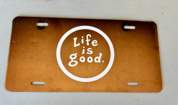 Life is good, custom license plate made from aluminum not plastic. Located in Brandon.
