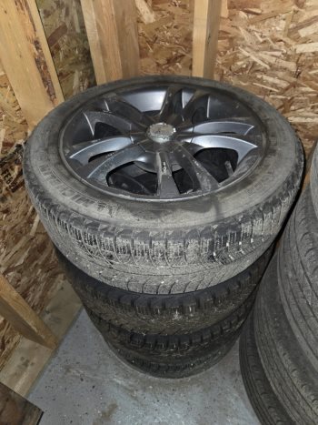 A set of four tires and aluminum rims, with two different sizes of lug nuts. Previously used on a 2015 Honda Civic (5X114.3). Two tires were replaced after only one year, the other two are still in good condition.