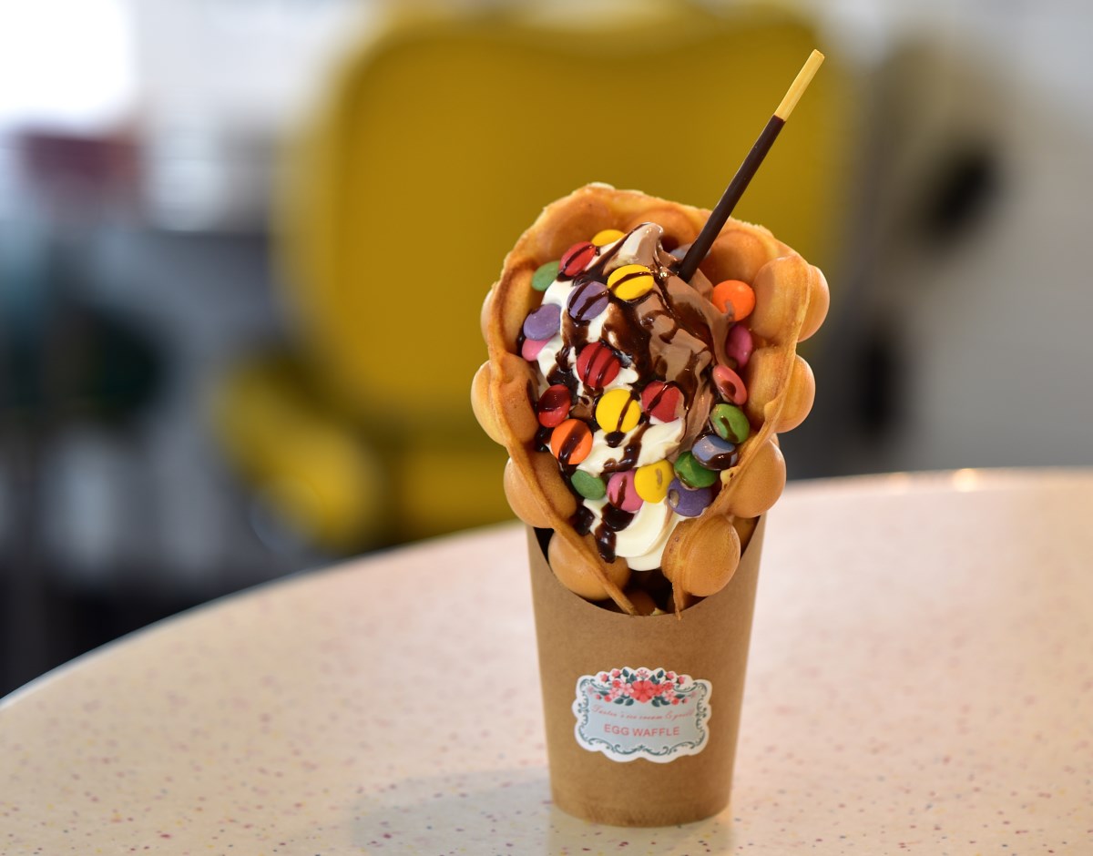 Egg waffles are available in chocolate and original flavours with choice of soft or hard ice cream and the opportunity to dress up with a topping of choice for $6.99.
