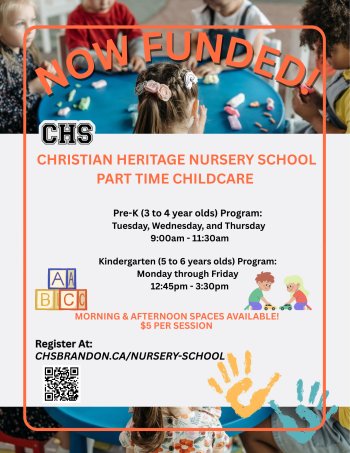 Christian Heritage Nursery School opened on January 5th, 2026! It is a play-based learning community focused on preparing children for kindergarten and enhancing their development through play. Morning & Afternoon Spaces available now! Register at: https://www.chsbrandon.ca/nursery-school.