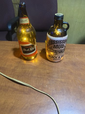 $30.00 each, Mississippi mud bottle great condition, plus a over size glass Black Label bottle with upper right corner label missing ( rare) piece.