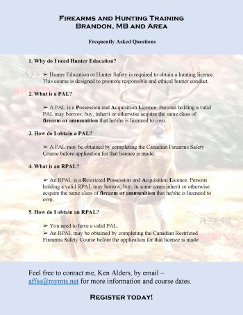 Feel free to contact me, Ken Alders, by email affss@mymts.net if you have any questions or would like to register for a course.