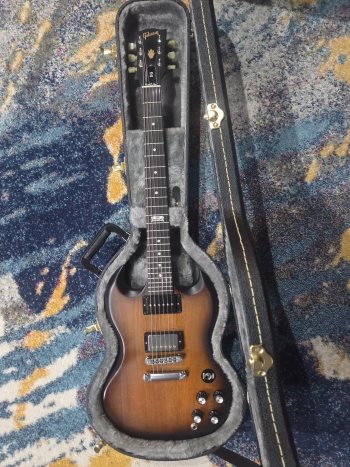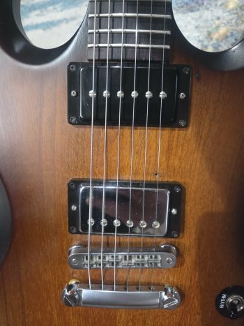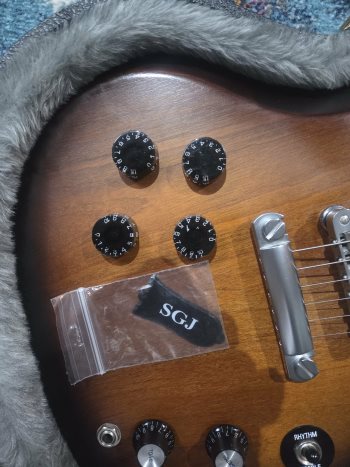 Neck pickup was changed to a P90 and bridge had cover added, top hat knobs are on it but original speed knobs are there as well as the original SGJ truss rod cover.