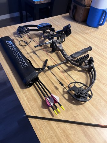 comes with sight, stabilizer, attached quiver, carry style quiver, 4 arrows, and release