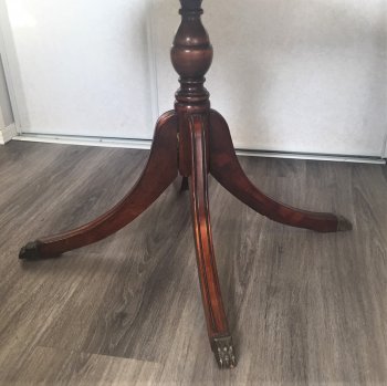 This round side table is 23 inches across and 19 inches tall. Metal covered feet on a tripod type stand. In the family since before 1950. Excellent condition, maker unknown.