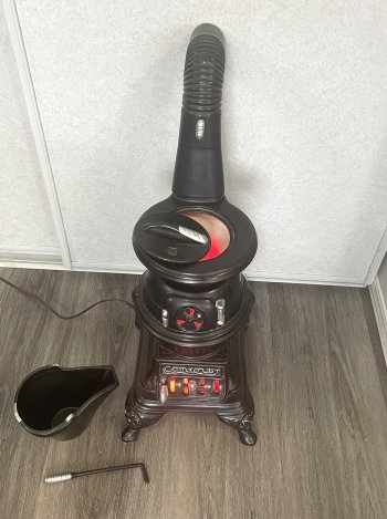 Very authentic looking vintage pot belly stove complete with coal bucket, poker and stove pipe that emits a fire type light through the vents, grates and top lid when turned on. What a great addition to the cabin, cottage or even the bar. The light stands 21 inches high, 13 inches deep and 8 inches wide. Ceramic construction.