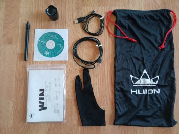 -Comes with pen with cap, a pen stand with 4 extra nibs inside, a USB cable to plug in tablet, a charging cable for the pen, a drawing glove, instruction manuals for both Windows and Mac, an installation cd, and a Huion drawstring bag