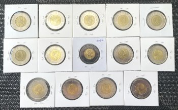 Full set of 14, Canada, coloured toonies, 2017 - 2025.