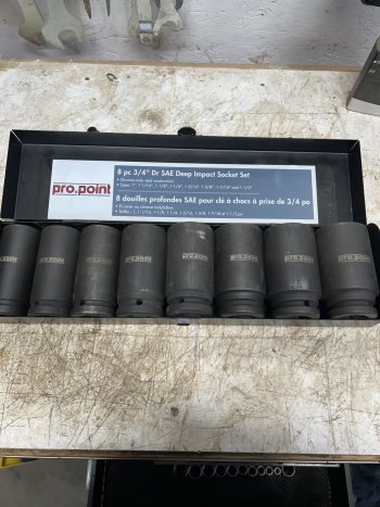 Pro point 8 pc 3/4 dr sae deep socket set compatible with snap on tools sizes range from 1?- 1 1/2? drives set is in new condition used once or twice asking $150.00 cash text or call Jeff at 204-522-5908