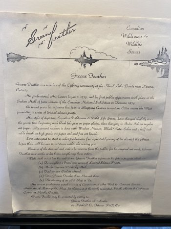 Large watercolour art by greenefeather an Ojibway artist from kenora Ontario measuring 24 x 17 1/2 with frame it?s 29 x 22 1/2 it?s ready to hang in excellent shape very large art picture email me if interested info about him is all in the back of picture