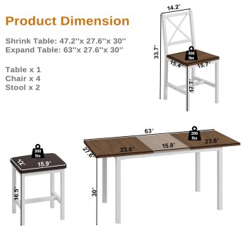 Recently purchased for a new home, but plans have changed. 7-piece farmhouse style dining table set. Expandable, 4 chairs and 2 stools, white and brown in color. Still in box. Can be delivered. 300 obo