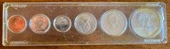!967 Canada mint set of six Centennial coins, four of which are silver. The actual silver weight is about 1.1 ounces. The coins are mounted in a plastic case and appear to be completely uncirculated. There is a bit of discolouration or tarnish on the "heads" side of some of the coins but I can't tell if it is on the coins or the case.
